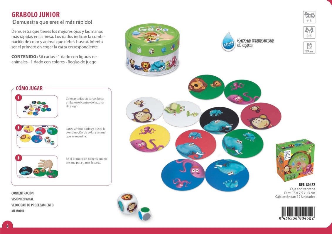 Demuestra que tienes los mejores ojos y las manos más rápidas en la mesa. Los dados indican la combinación de color y animal que debes buscar. Intenta ser el primero en coger la carta correspondiente.