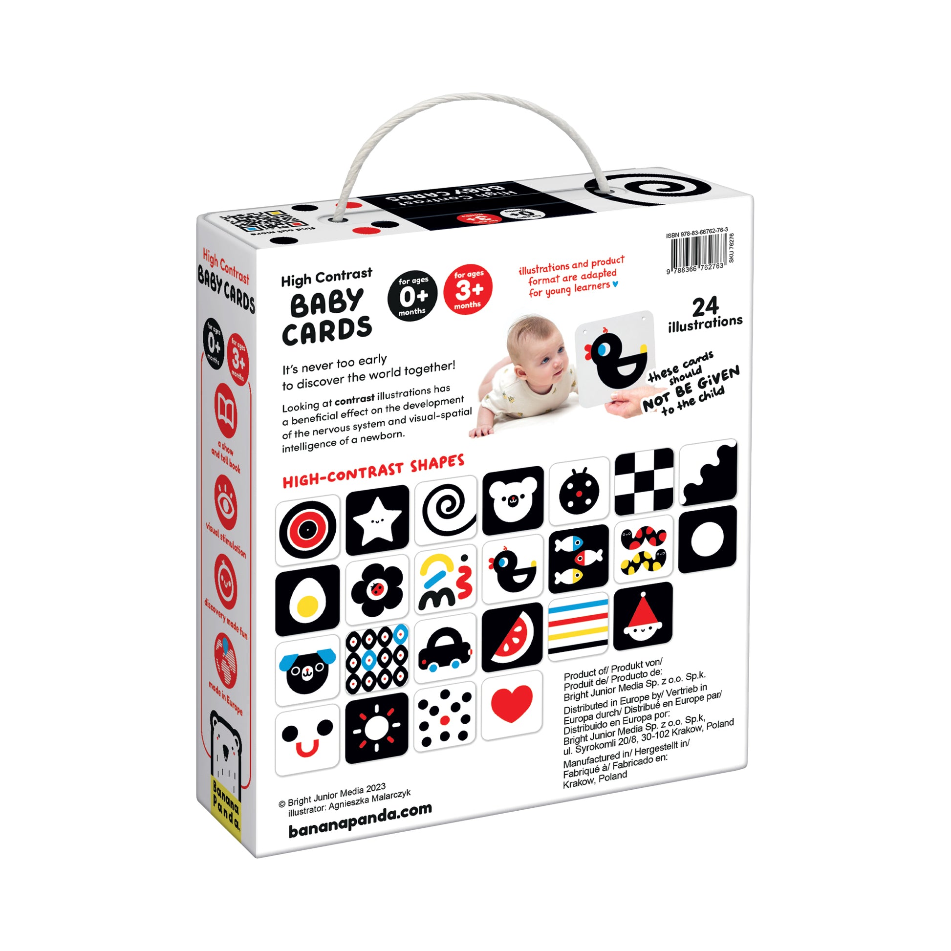 Al nacer, la vista todavía está poco desarrollada. Al principio, los bebés ven mejor los patrones claros y de alto contraste, y la capacidad de distinguir los detalles y los colores de las imágenes se desarrolla gradualmente a lo largo de los meses siguientes. Por eso a los bebés les gustan tanto los contrastes. Los padres pueden colgar un folleto o tarjetas individuales junto a la cama o el cochecito, o crear una espectacular guirnalda. En la guía adjunta al set encontrará mucha información interesante y práctica sobre el desarrollo de los bebés y cómo divertirse juntos.